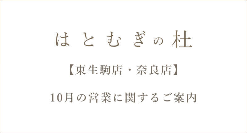 平素より「はとむぎの杜」をご愛顧賜り、誠にありがとうございます。 「はとむぎの杜」東生駒店・奈良店における2025年10月の営業予定につきまして、下記の通りご案内申し上げます。 はとむぎ製品の販売につきまし…